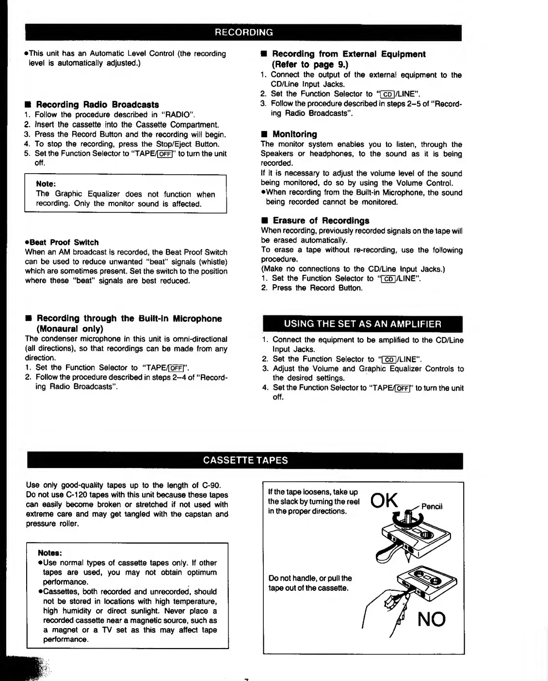 Panasonic RX-CS710 - Recording Functions; Recording Radio Broadcasts; Recording from External Sources; Built-in Microphone Recording