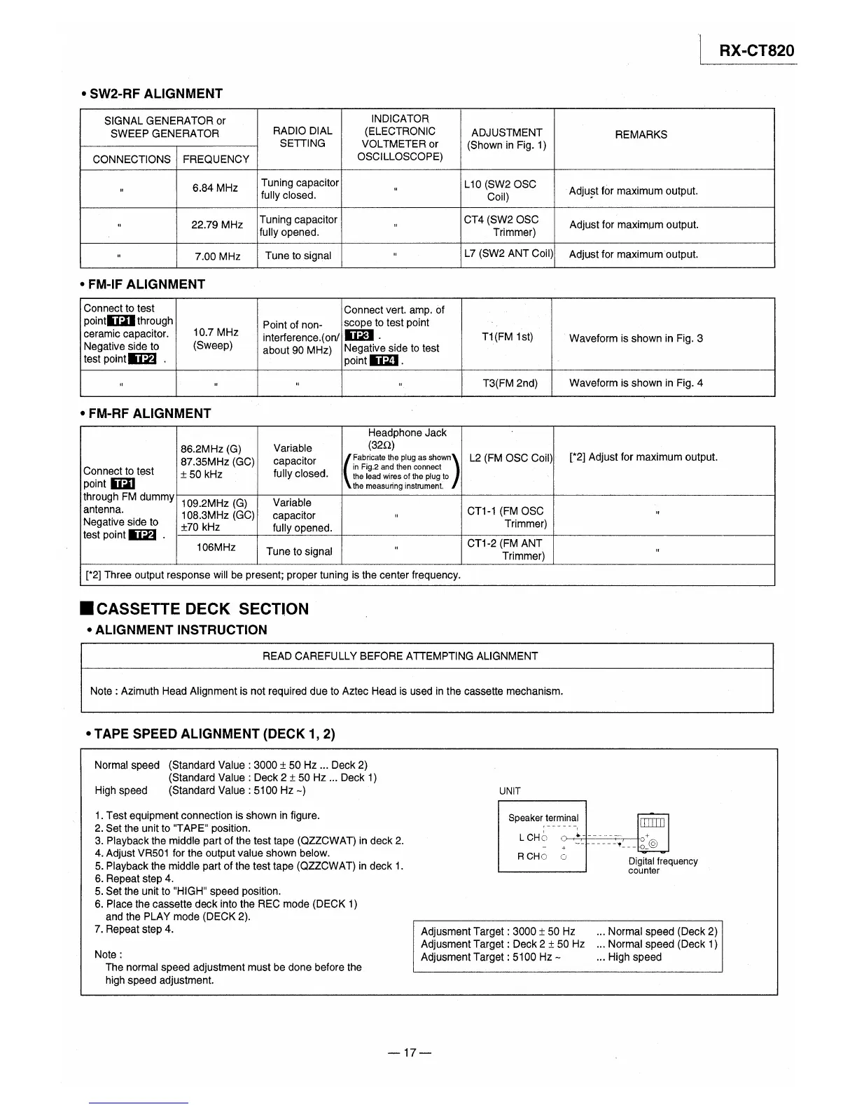 Panasonic RX-CT820 - SW2 and FM Alignment Procedures; Cassette Deck Speed Alignment