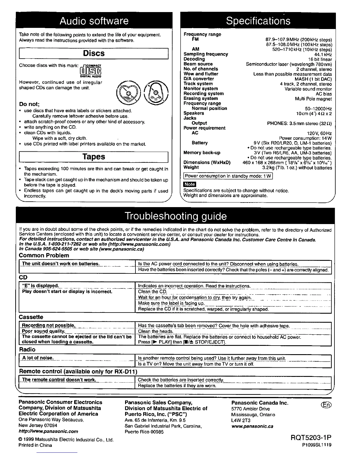 Panasonic RX-D11 - Audio Software Care; Disc Handling; Tape Handling; Product Specifications