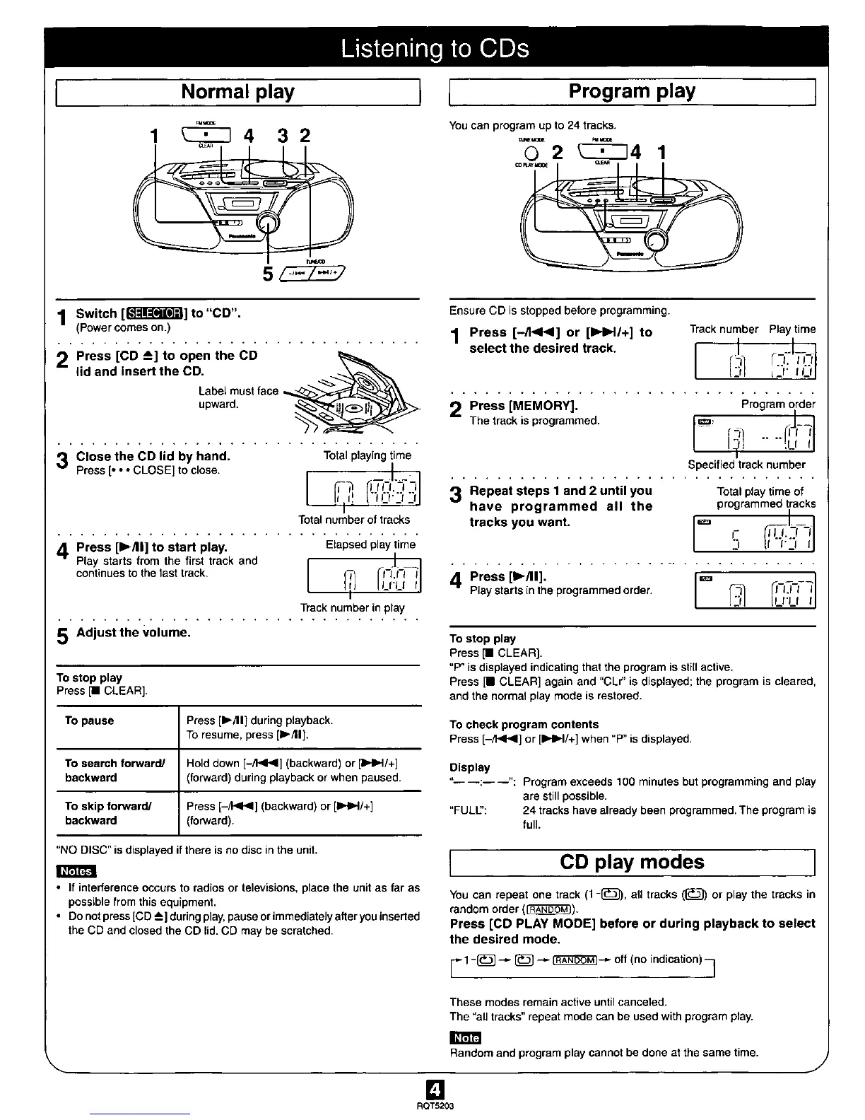 Panasonic RX-D11 - CD Playback; Normal CD Playback; Program Playback; CD Play Modes