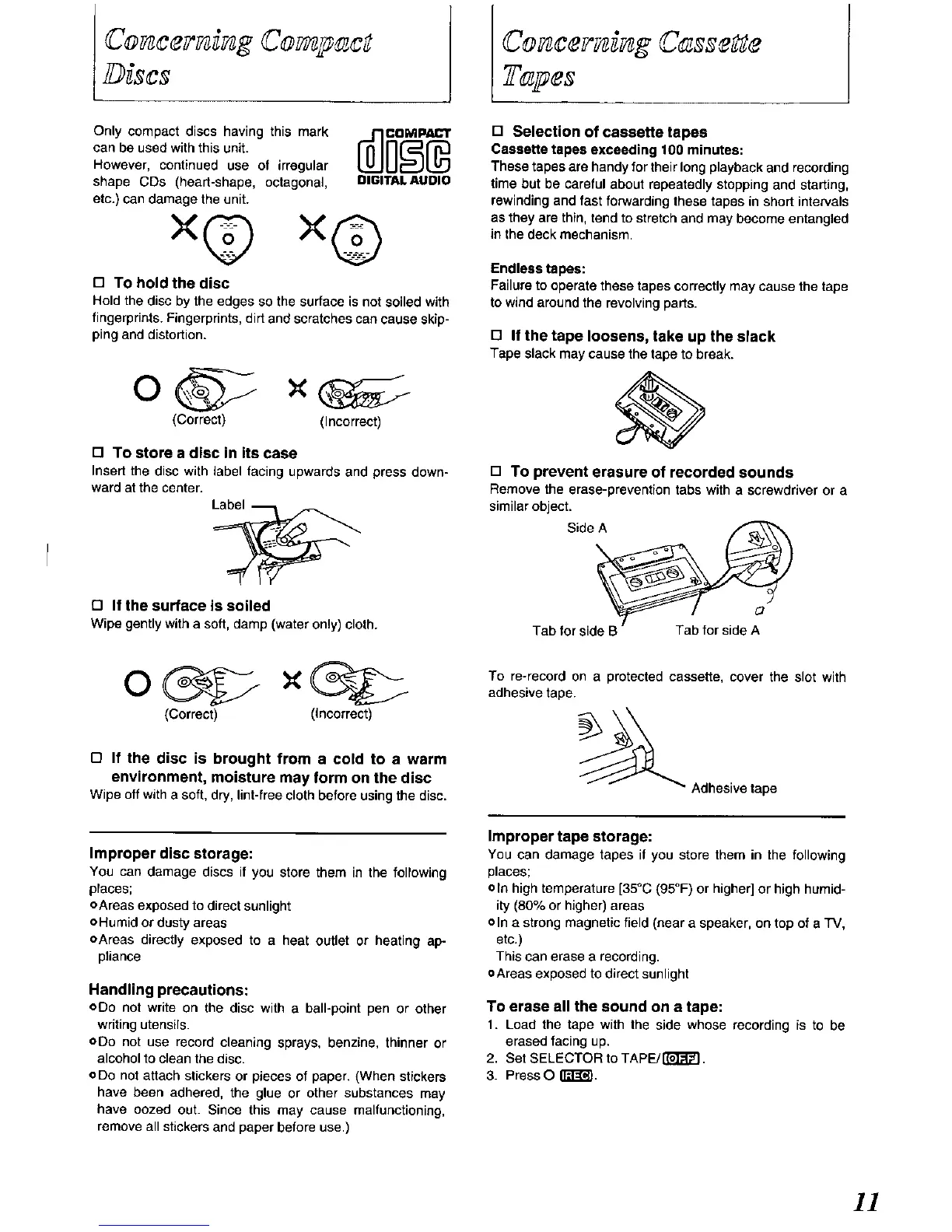 Panasonic RX-DS11 - Disc and Tape Care; Concerning Compact Discs; Concerning Cassette Tapes