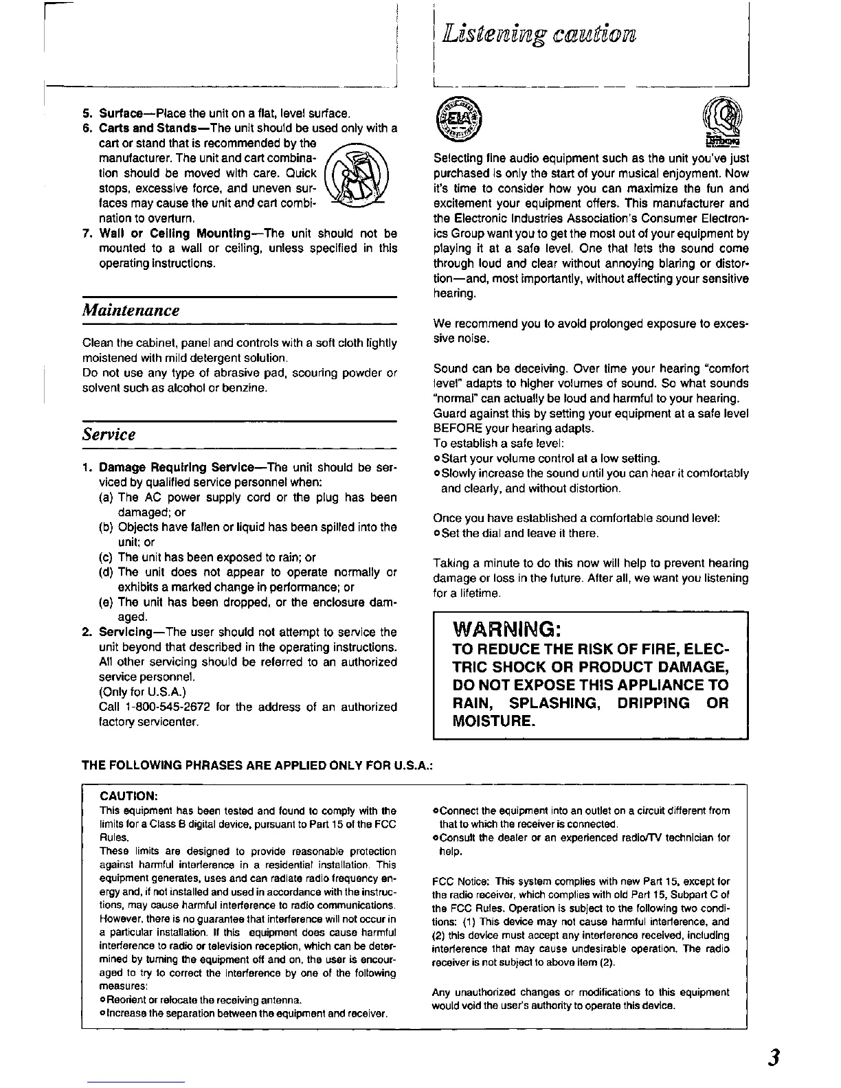 Panasonic RX-DS11 - Listening and Maintenance; Listening Cautions; Maintenance and Servicing