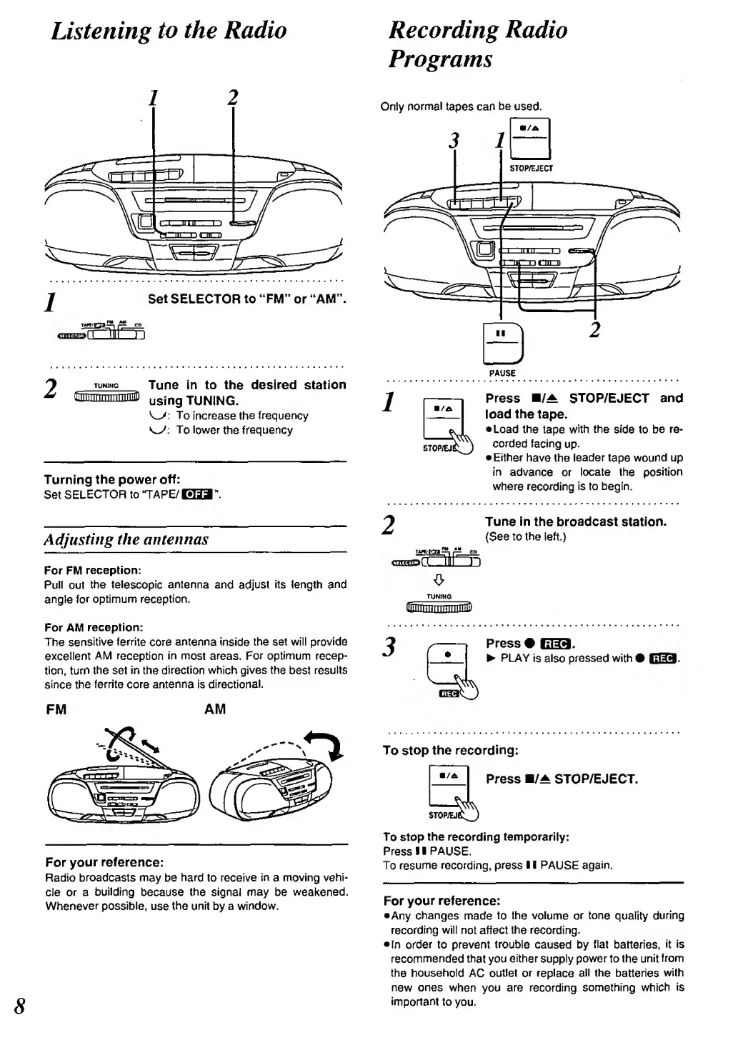 Panasonic RX-DS12 - Listening to the Radio; Tuning Stations; Recording Radio Programs; Preparing for Recording