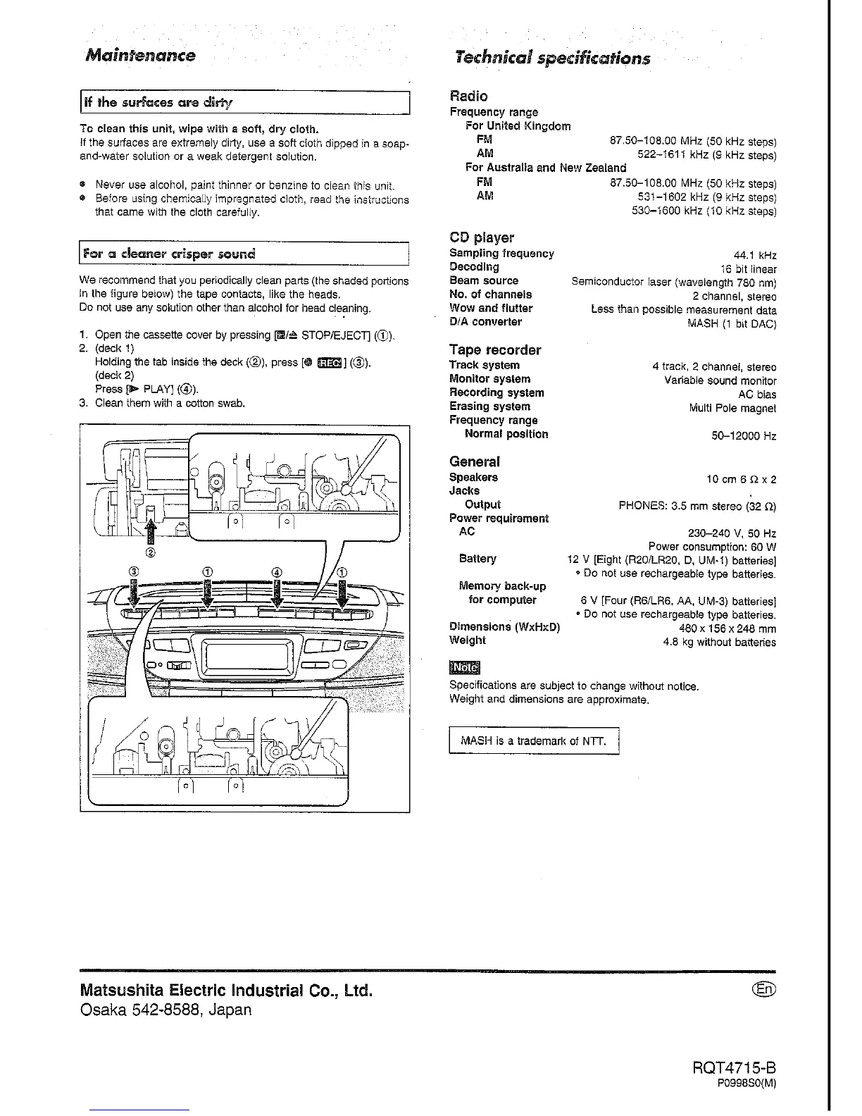 Panasonic RX-DT39 - Unit Care and Cleaning; Exterior Surface Cleaning; Tape Head and Contact Cleaning
