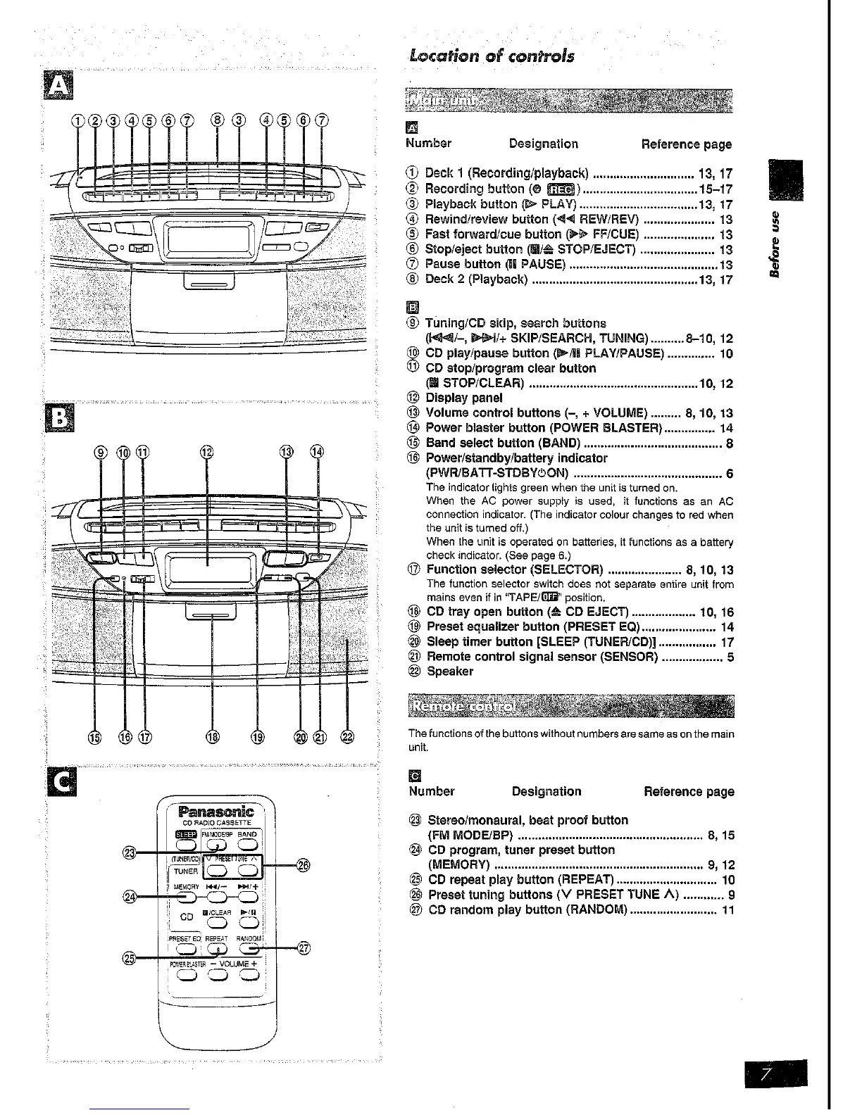 Panasonic RX-DT39 - Control Panel Layout; Main Unit Button Identification; Remote Control Button Identification