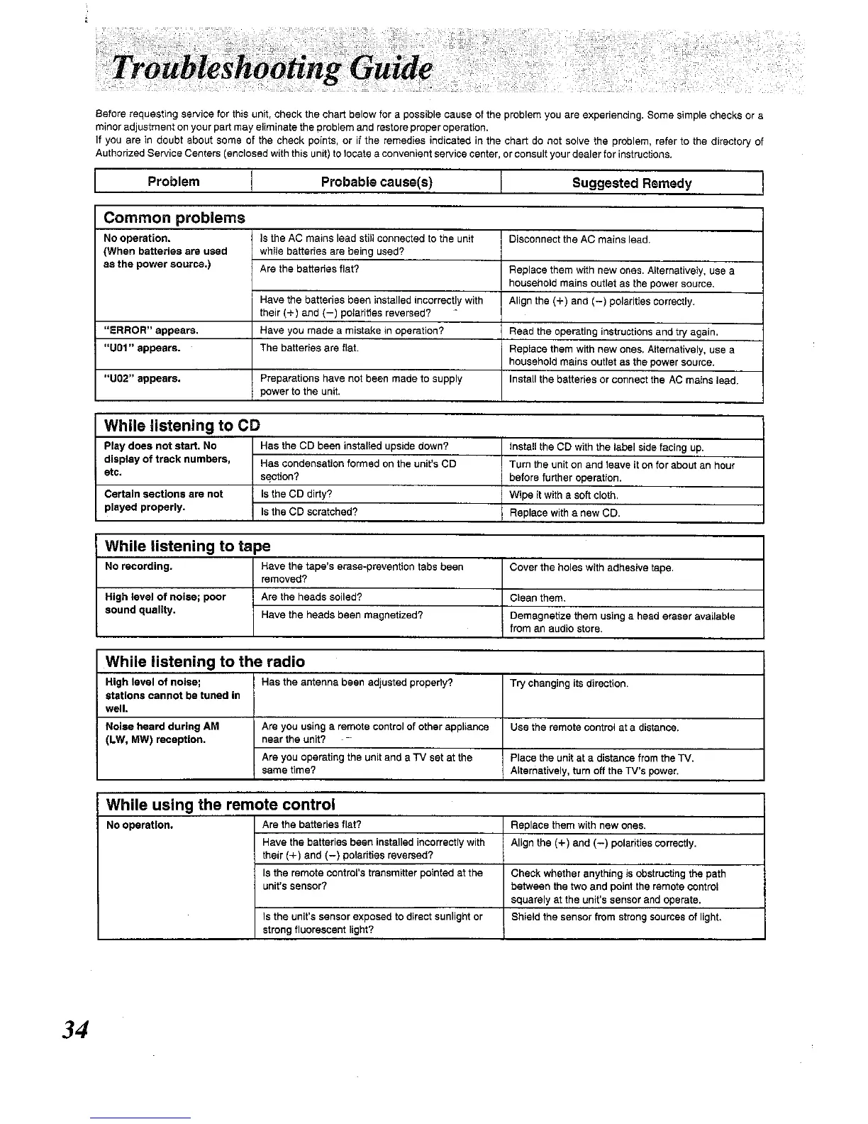 Panasonic RX-E300 - Troubleshooting Common Issues; General Operation Problems; CD Playback Troubleshooting; Tape Playback Troubleshooting