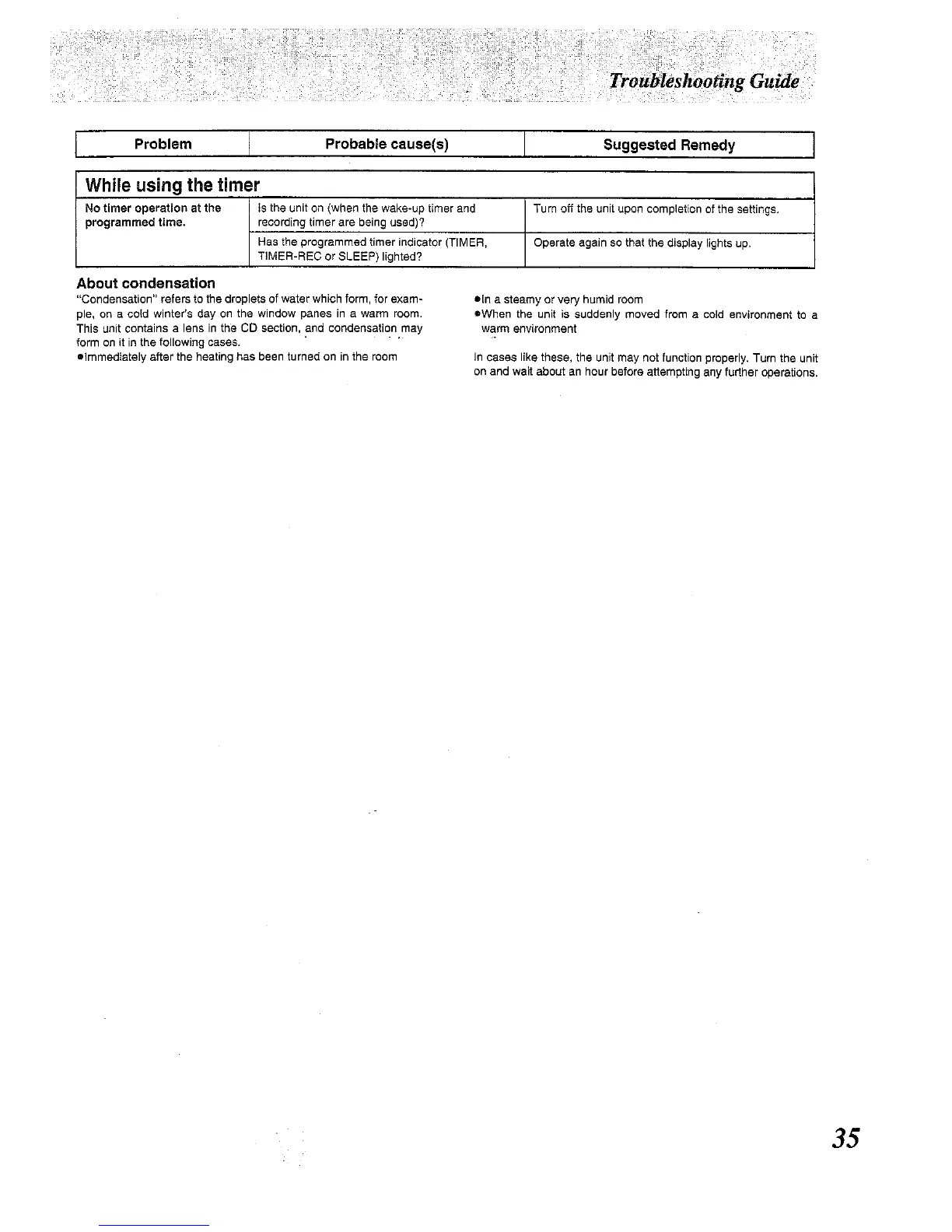 Panasonic RX-E300 - Troubleshooting Timers and Condensation; Timer Operation Issues; Condensation Related Issues