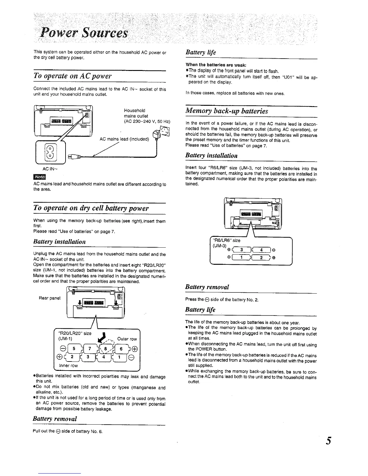 Panasonic RX-E300 - Power Sources; Operating on AC Power; Operating on Battery Power; Battery Installation and Removal