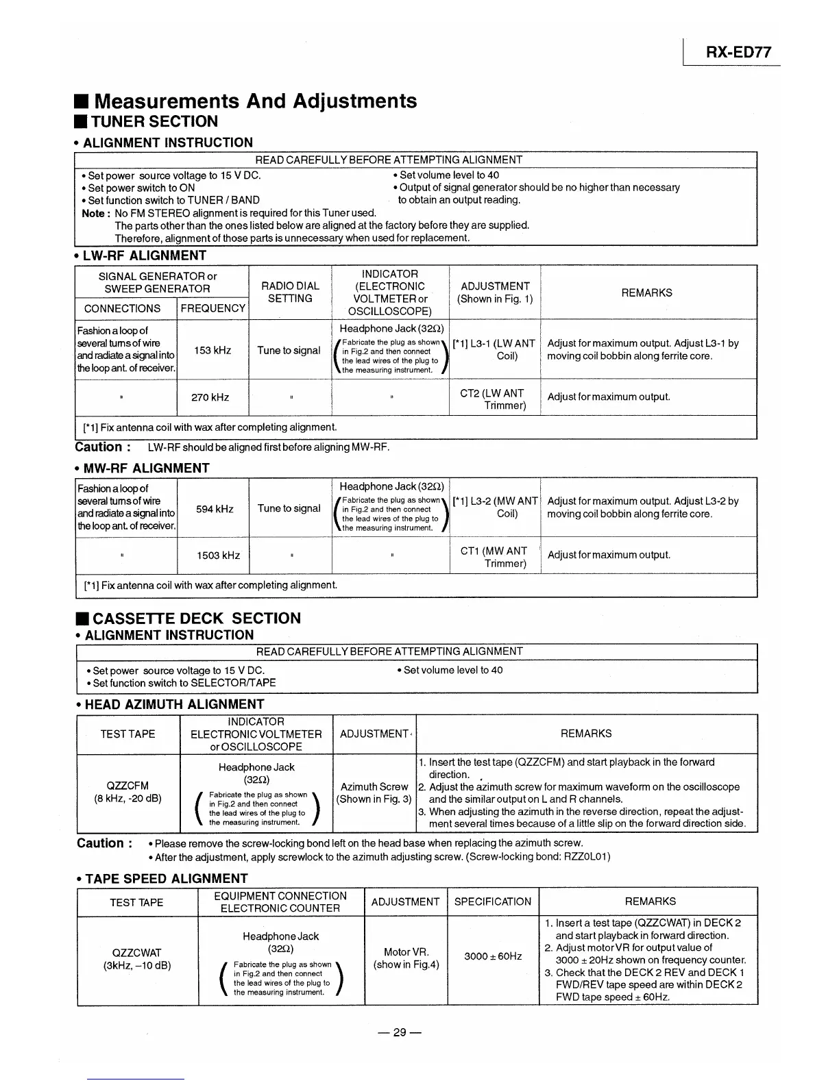 Panasonic RX-ED77 - Measurements And Adjustments; Tuner Section Alignments; Cassette Deck Alignments