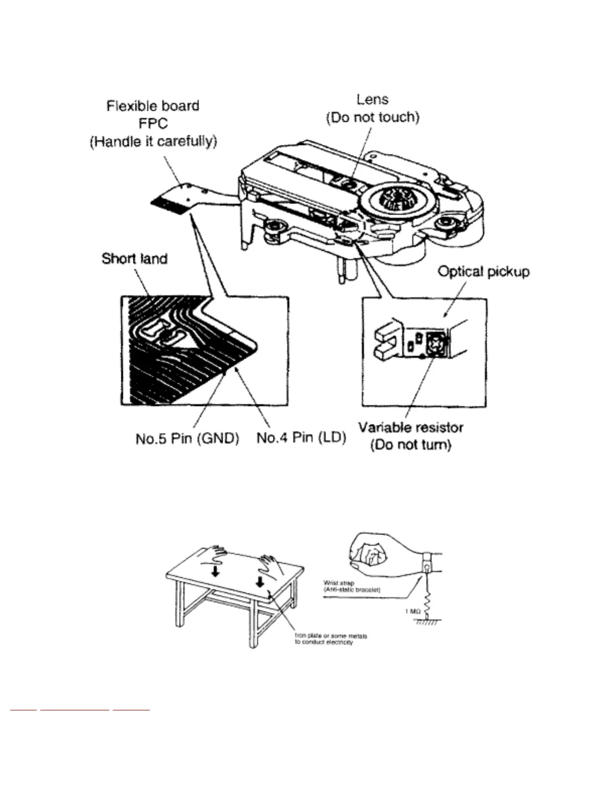 The traverse deck has a short point shorted with solder to protect the laser diode against electrostatics