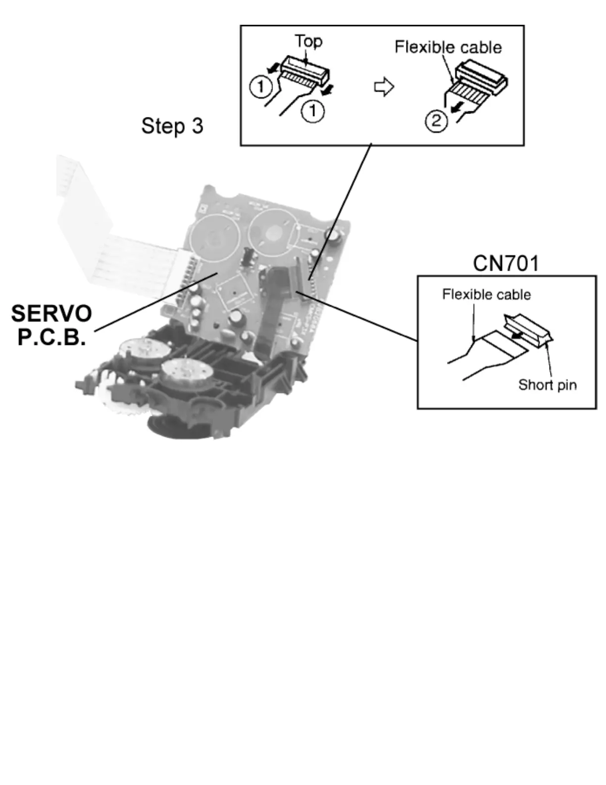 Push the top of the connector in the direction of arrow 1 and pull out the flexible cable in the direction of arrow