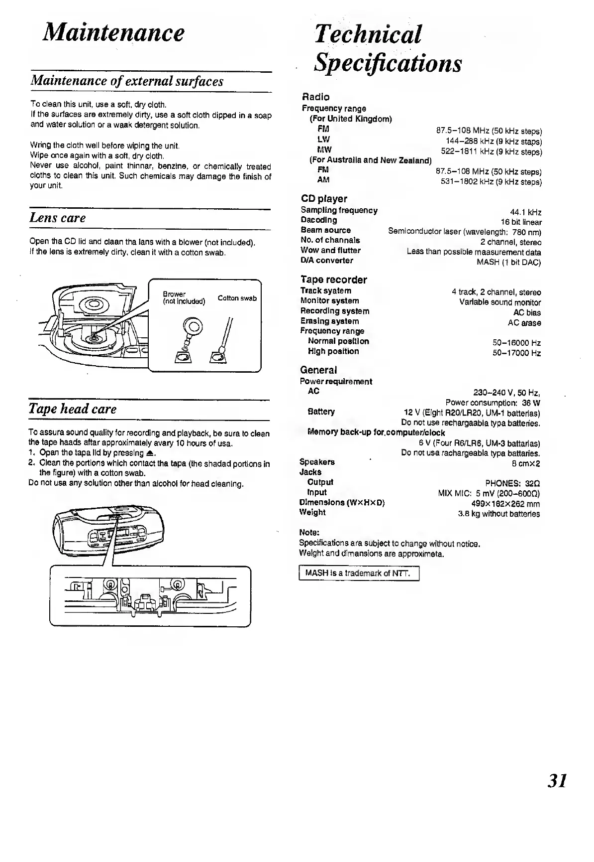 Panasonic RX-ES50 - Maintenance; Technical Specifications
