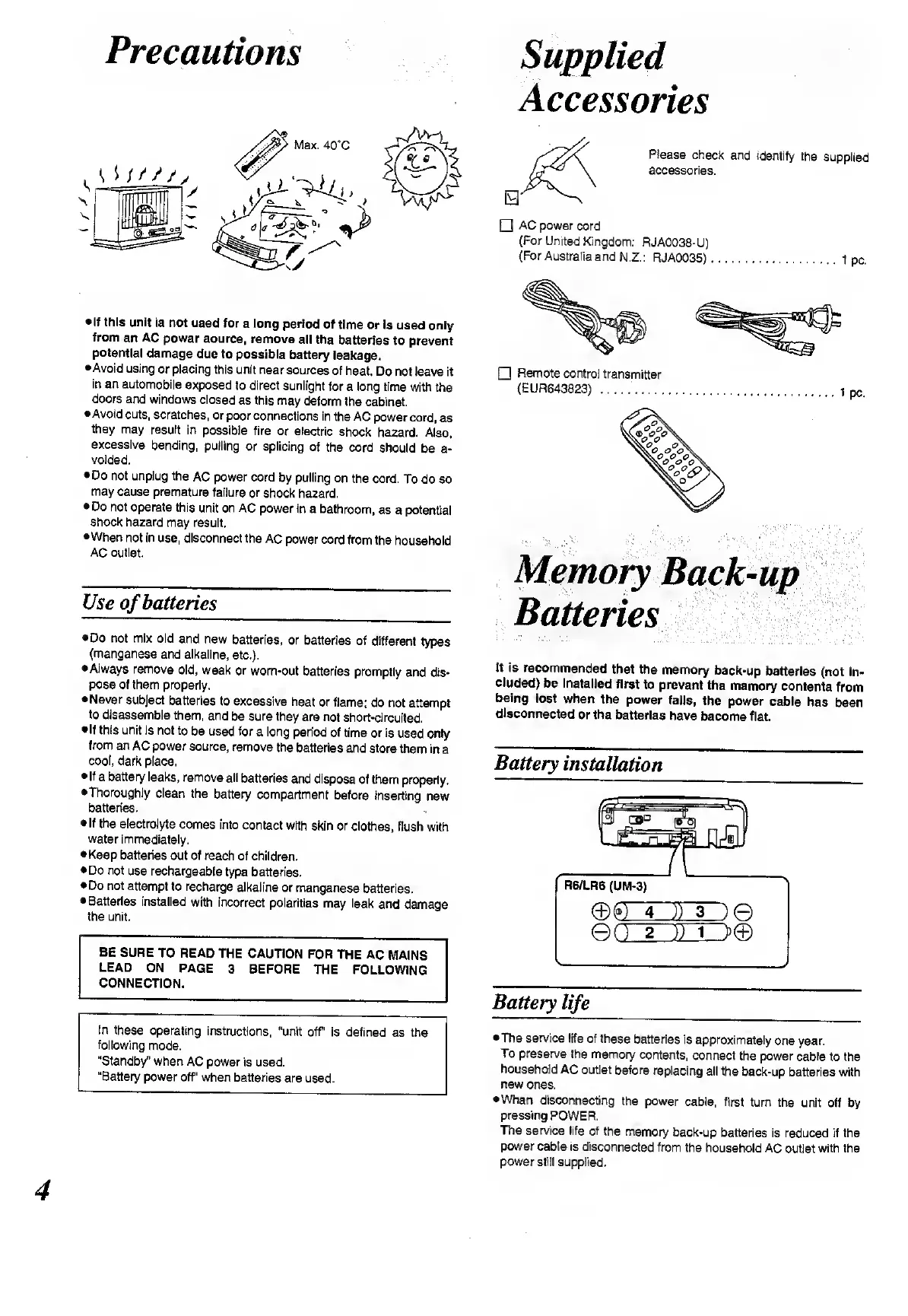 Panasonic RX-ES50 - Precautions; Supplied Accessories; Memory Back-Up Batteries