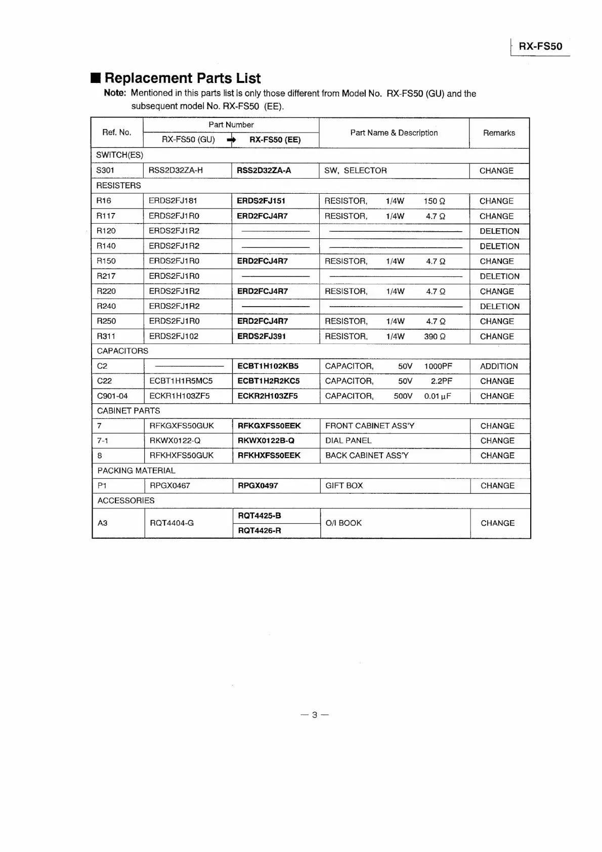 Panasonic RX-FS50 - Replacement Parts List (Model Differences)