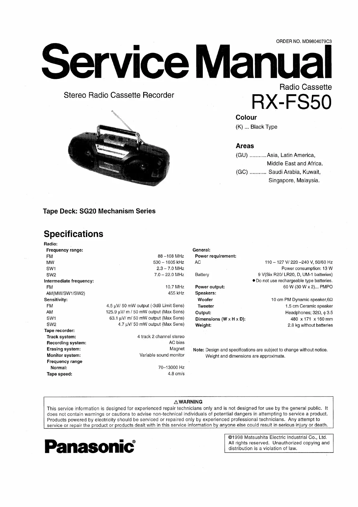 Panasonic RX-FS50 - Detailed Specifications; Radio Frequency and Sensitivity Specs; Tape Recorder and General Specs