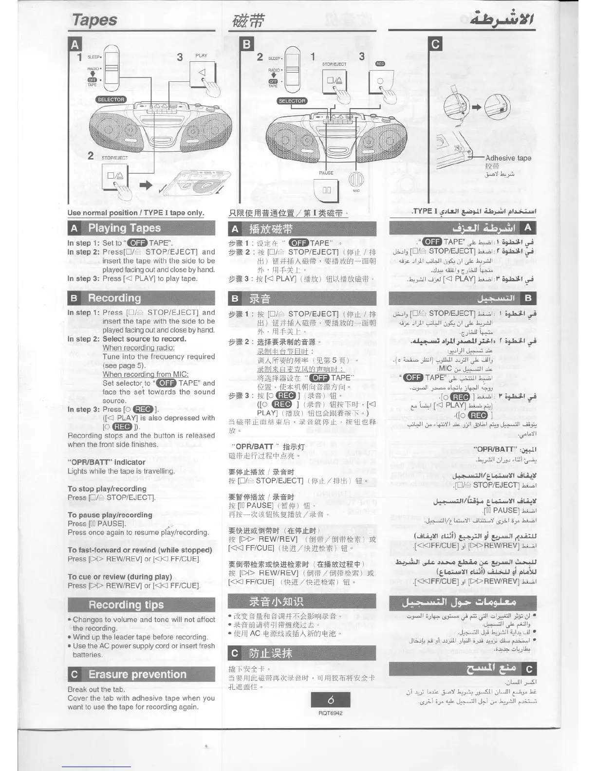 Panasonic RX-FS70 - Tapes; Playing Tapes; Recording; Recording Tips