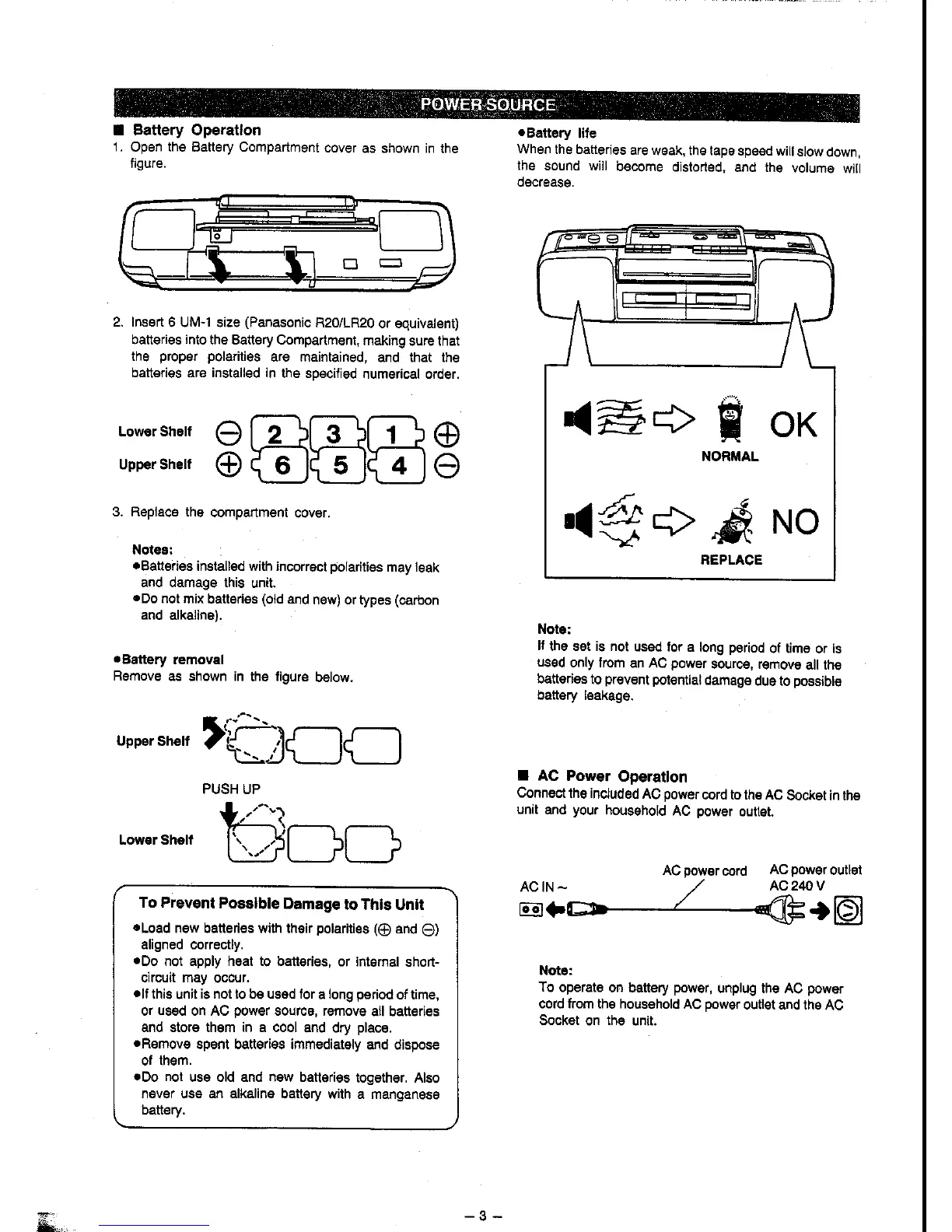 Panasonic RX-FT500 - Power Source; Battery Operation; AC Power Operation; Power Source Safety Precautions