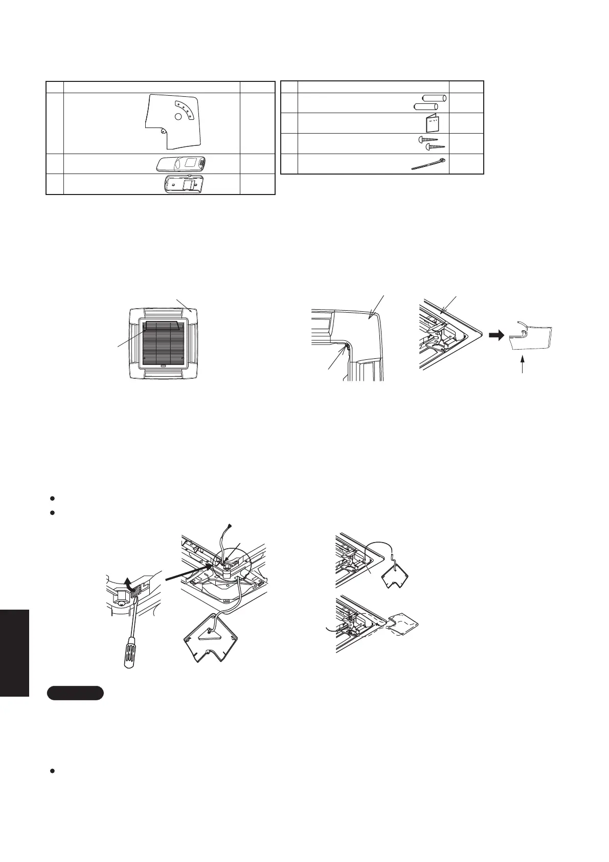 (5) Hang the string on the corner cover onto the pin on the ceiling panel as shown in the diagram. Then slide the corner