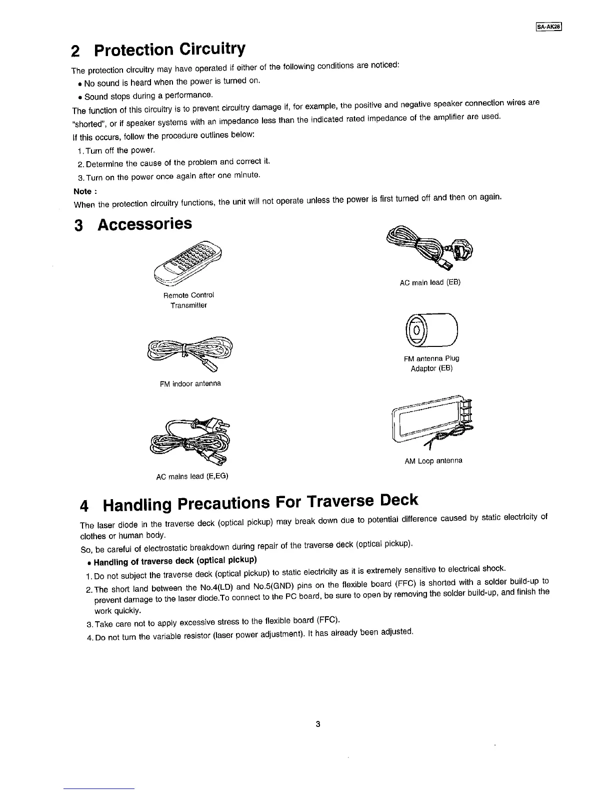 Panasonic SA-AK28 - 2 Protection Circuitry; 3 Accessories; 4 Handling Precautions For Traverse Deck