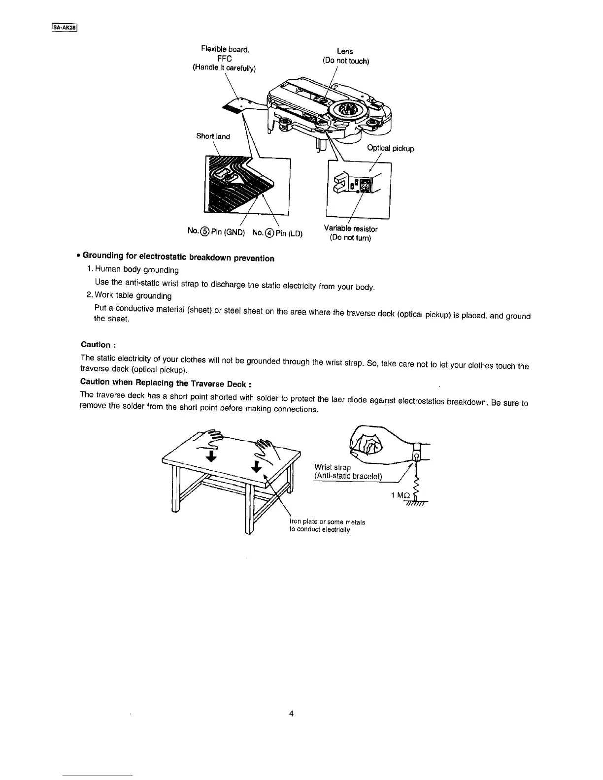 Panasonic SA-AK28 - 4 Handling Precautions For Traverse Deck; Grounding for electrostatic breakdown prevention; Caution when Replacing the Traverse Deck