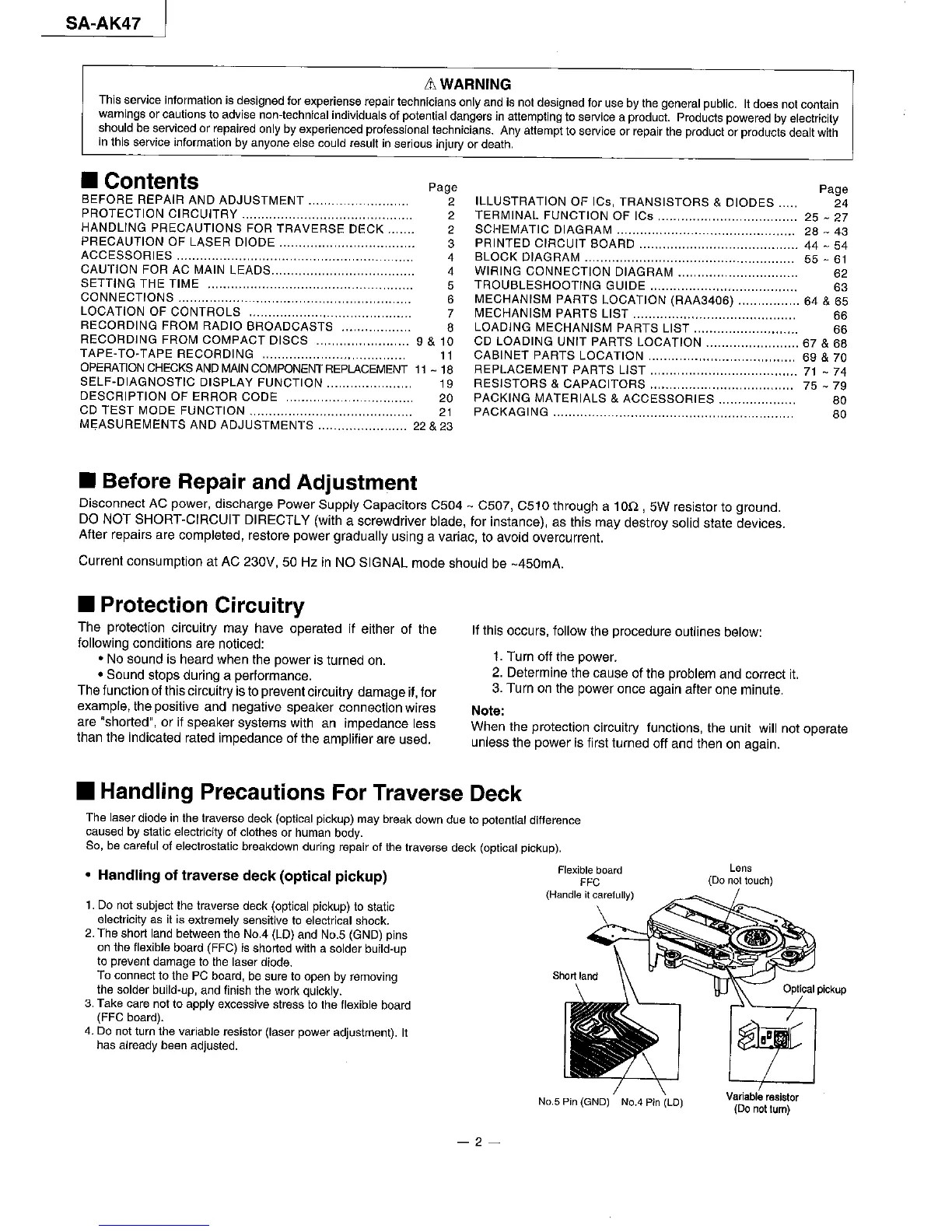 Panasonic SA-AK47 - Service and Handling Precautions; Before Repair and Adjustment Procedures; Protection Circuitry Operation; Traverse Deck Handling Precautions