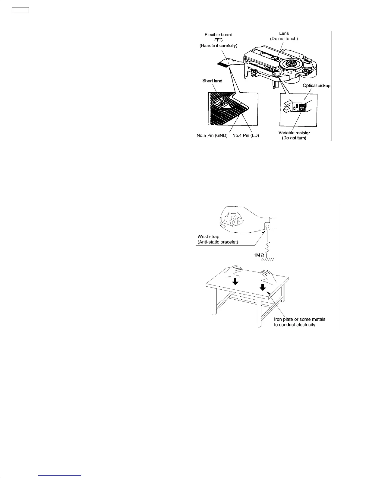 1. Do not disassemble the optical pick up unit, since radiation from exposed laser diode is dangerous.