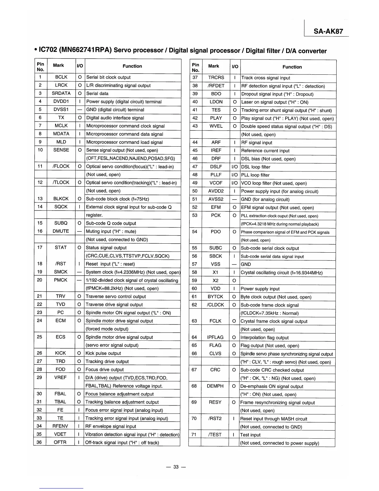 Panasonic SA-AK87 - IC Terminal Functions Continuation; IC702 Digital Sound Processor Pin Functions