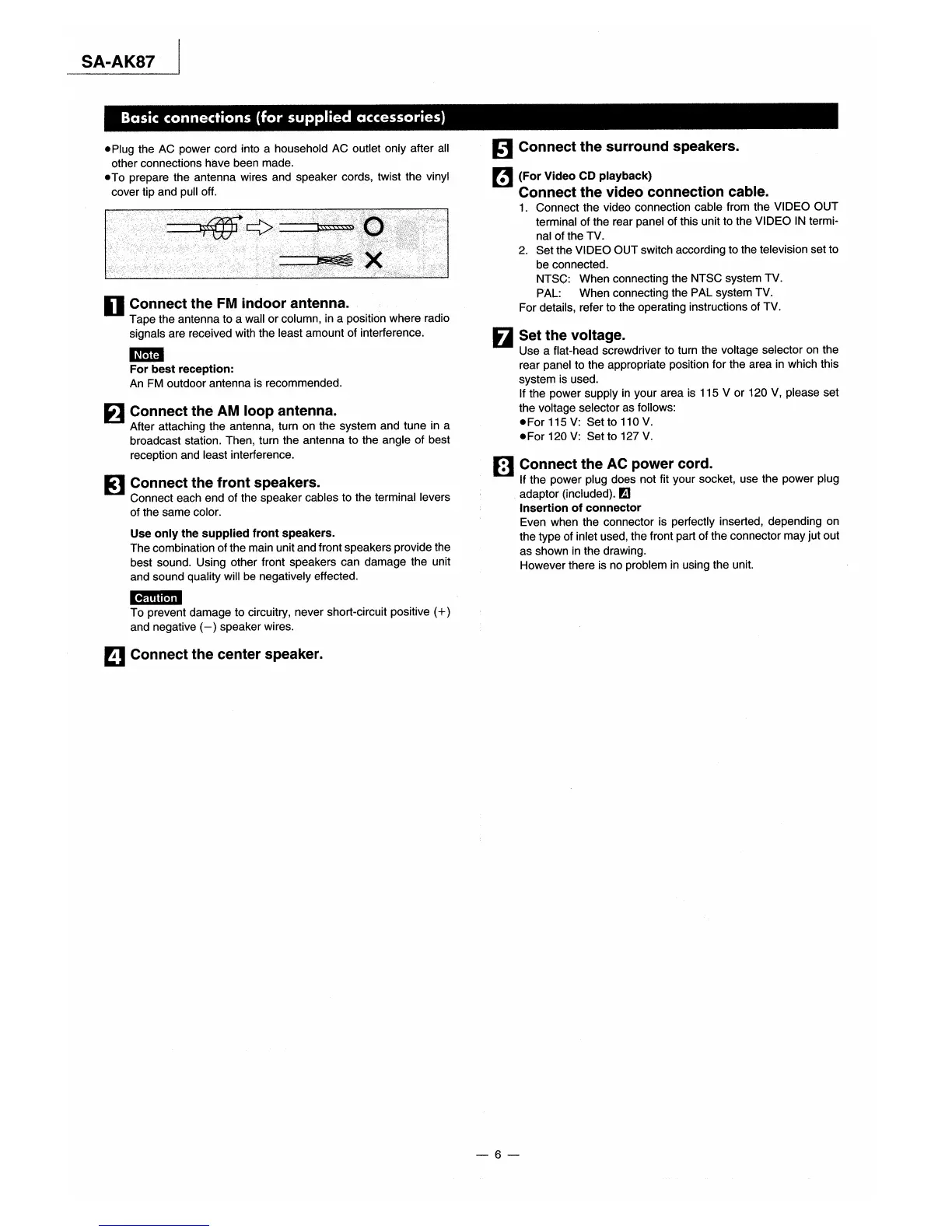 Panasonic SA-AK87 - Initial Setup and Connections; Connecting Antennas and Speakers; Video and Power Cord Connection; Voltage Selector Adjustment