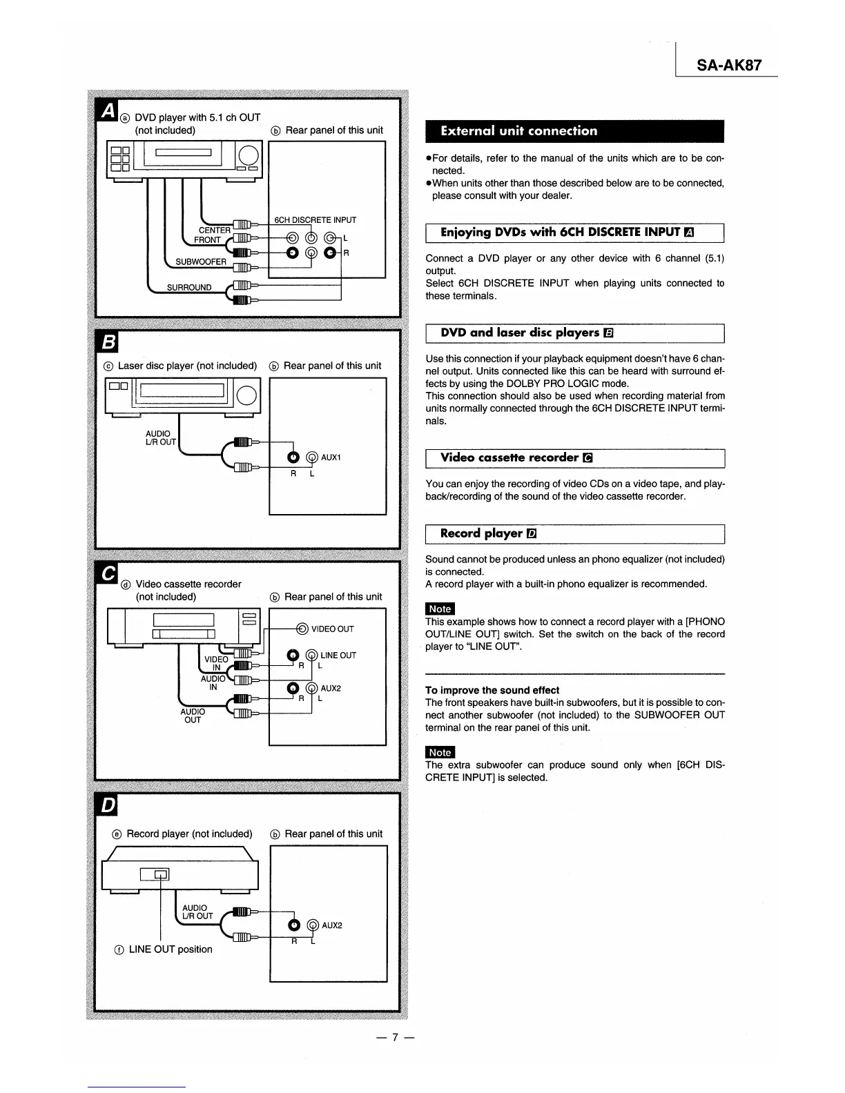 Panasonic SA-AK87 - External Unit Connectivity; Connecting DVD and Laser Disc Players; Video Cassette Recorder Connection; Record Player Connection