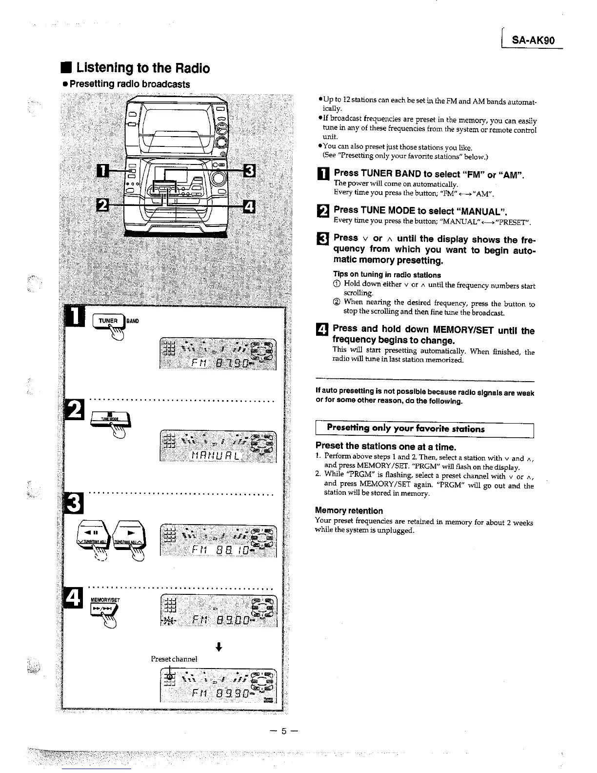 Panasonic SA-AK90 - Listening to the Radio; Presetting radio broadcasts; Presetting favorite stations
