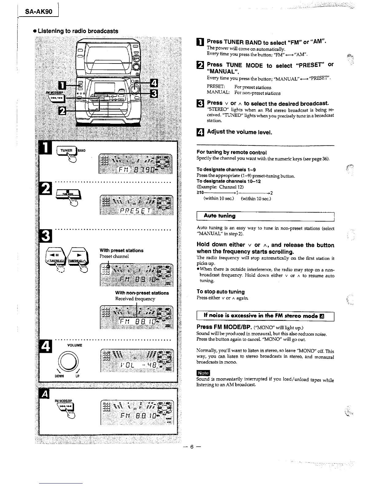 Panasonic SA-AK90 - Listening to the Radio Broadcasts; Auto Tuning; If Noise Is Excessive in the FM Stereo Mode