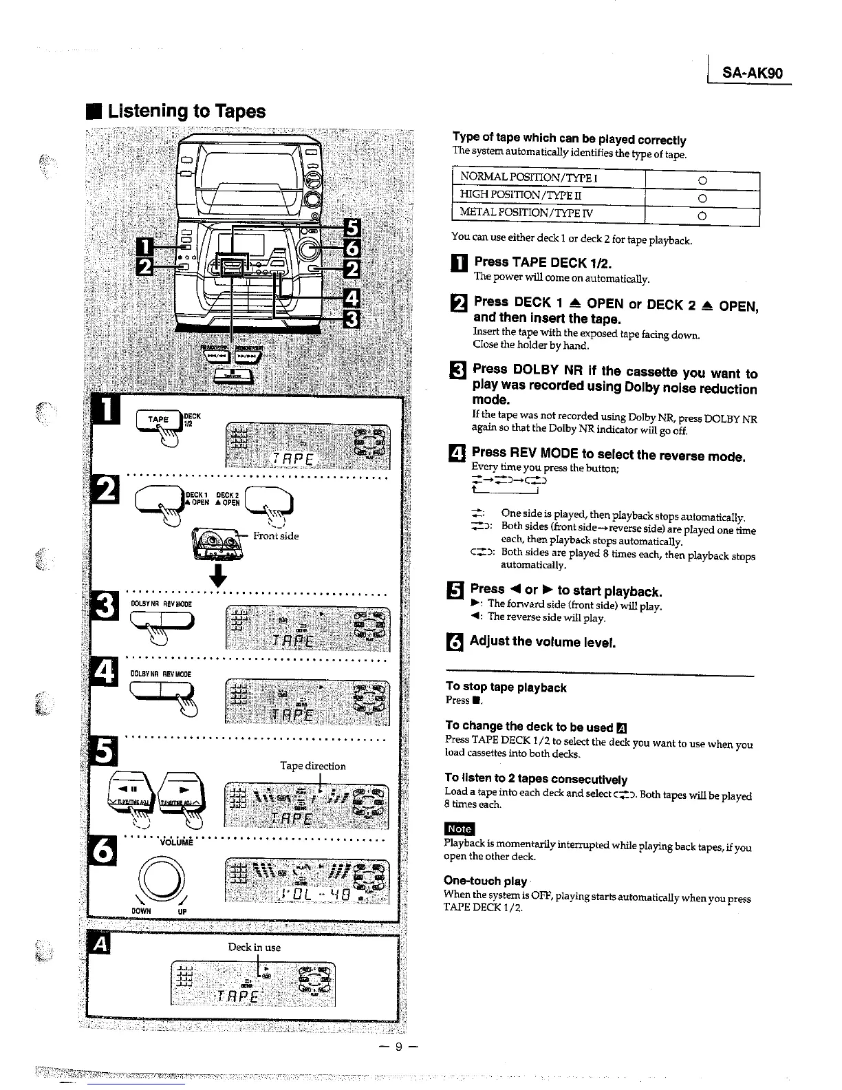 Panasonic SA-AK90 - Listening to Tapes; Tape playback overview; Inserting tapes; Dolby NR and Reverse Mode