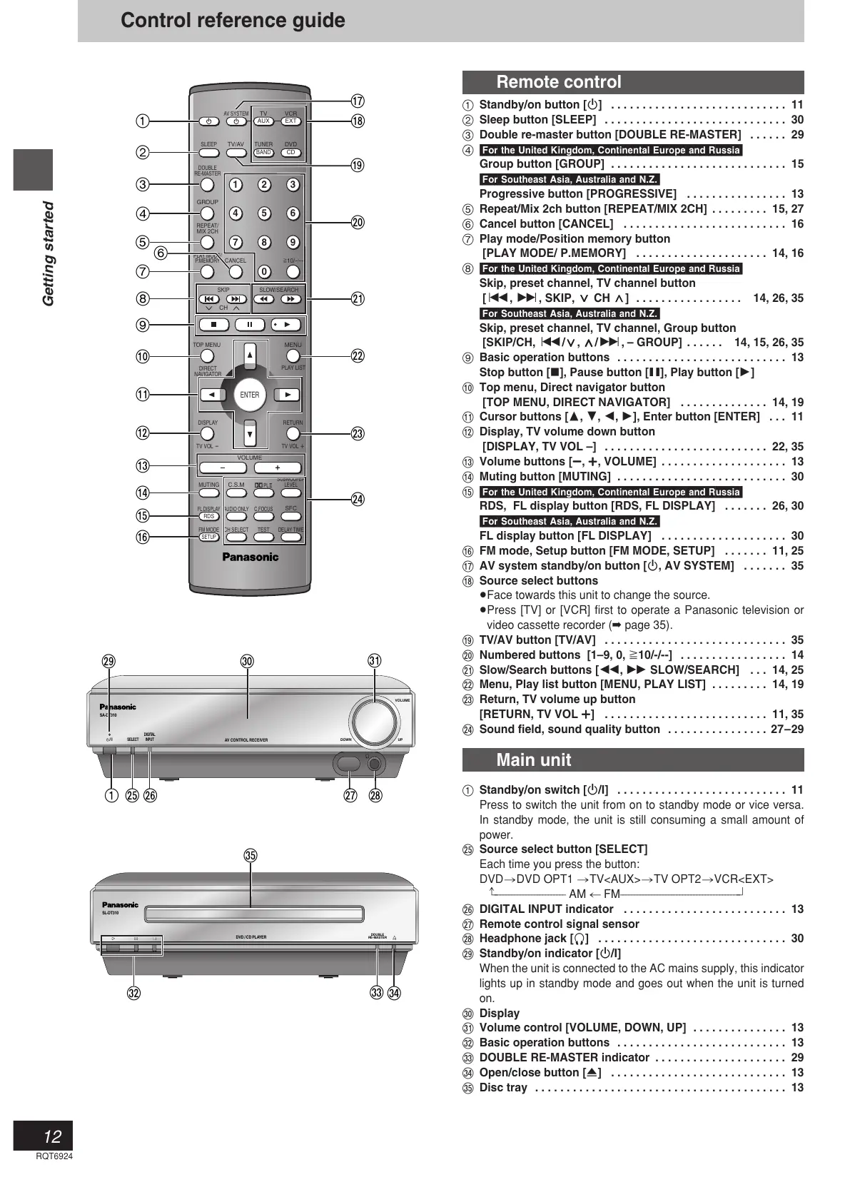 Panasonic SA-DT310 - Control Reference Guide; Remote Control Button Functions; Main Unit Controls and Indicators