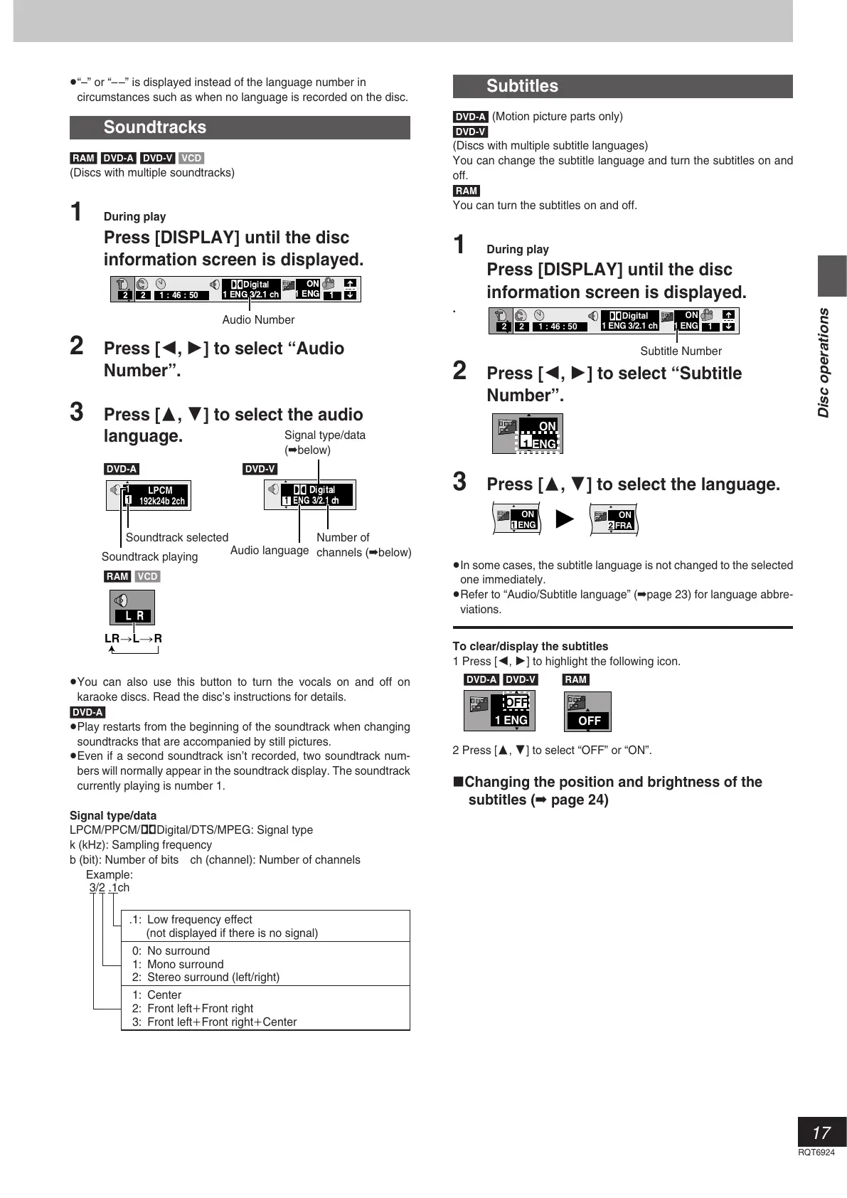 Panasonic SA-DT310 - Disc Operations: Soundtracks and Subtitles; Selecting Soundtracks and Audio Languages; Managing Subtitle Display Options