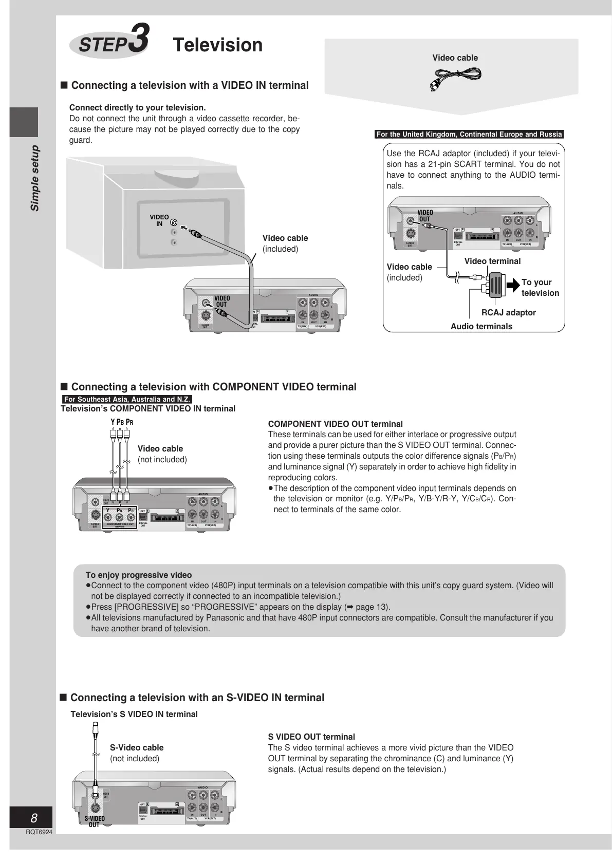 Panasonic SA-DT310 - Simple Setup: Step 3 - Connecting to Television; Connecting via VIDEO IN Terminal; Connecting via Component or S-Video