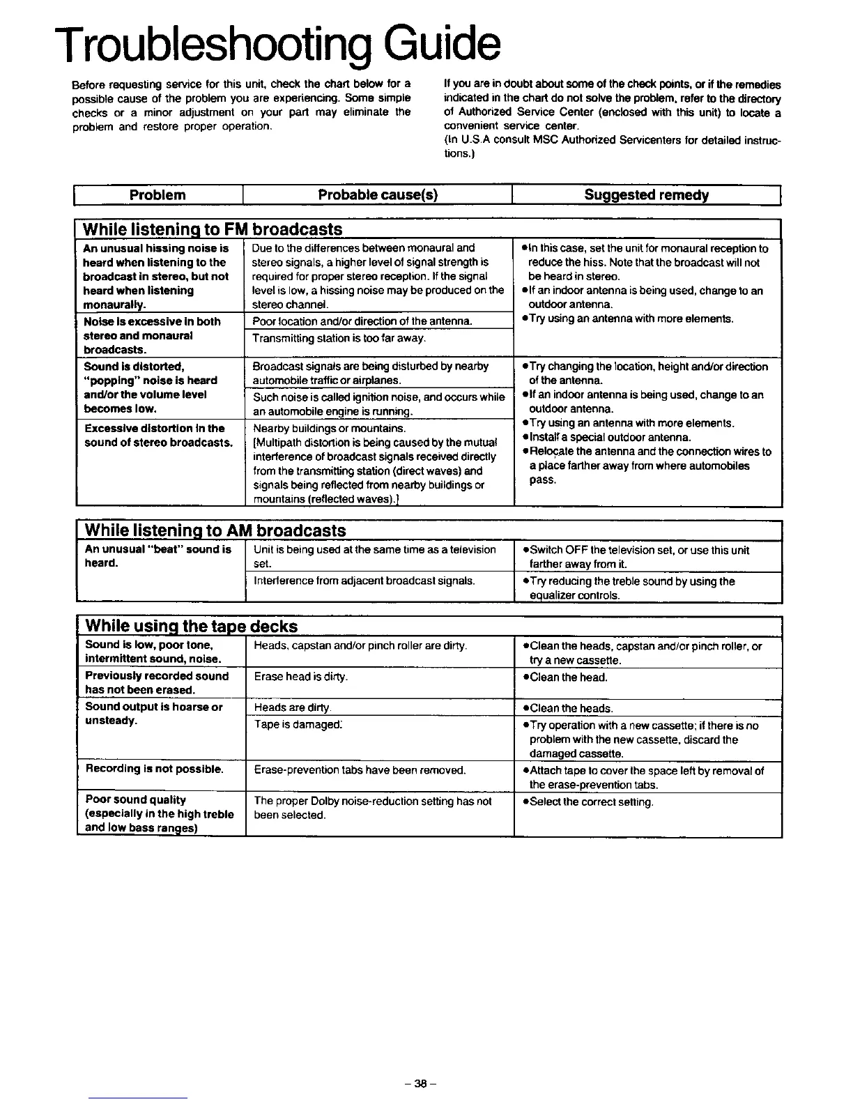 Sound is low, poor tone, Heads, capstan and/or pinch roller are dirty. •Clean the heads, capstan and/or pinch roller, or