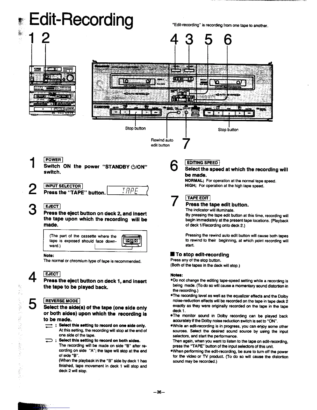 Panasonic SA-HD52 - Tape-to-Tape Recording; Setting Up Tape Edit Recording; Tape Speed and Edit Controls