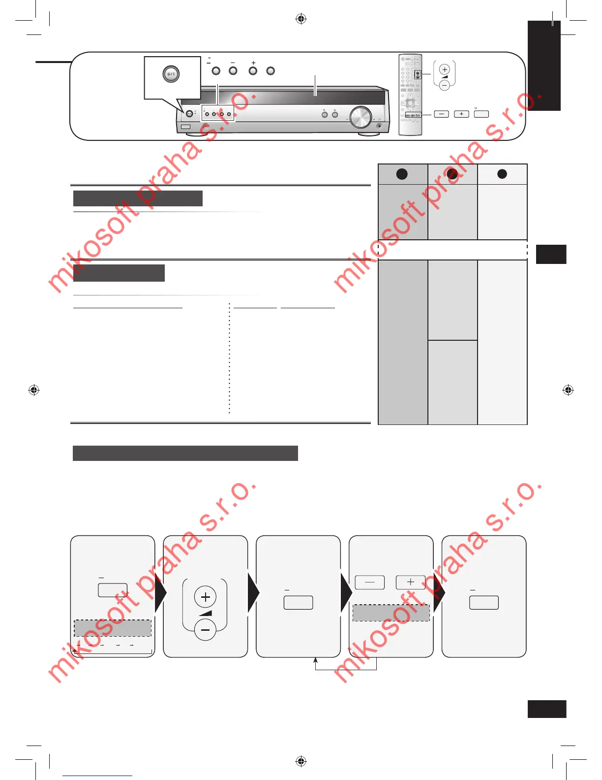 Reproduktory C (centrální), SR (pravý prostorový) a SL (levý prostorový) lze nastavit v rozmezí -10 dB až +10 dB, 0 dB je