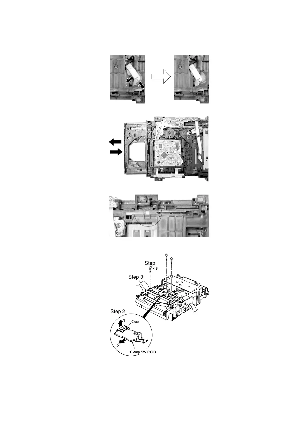 Step 2 With lifting the claw in the direction of arrow 1, draw the clamp SW P.C.B. in the direction