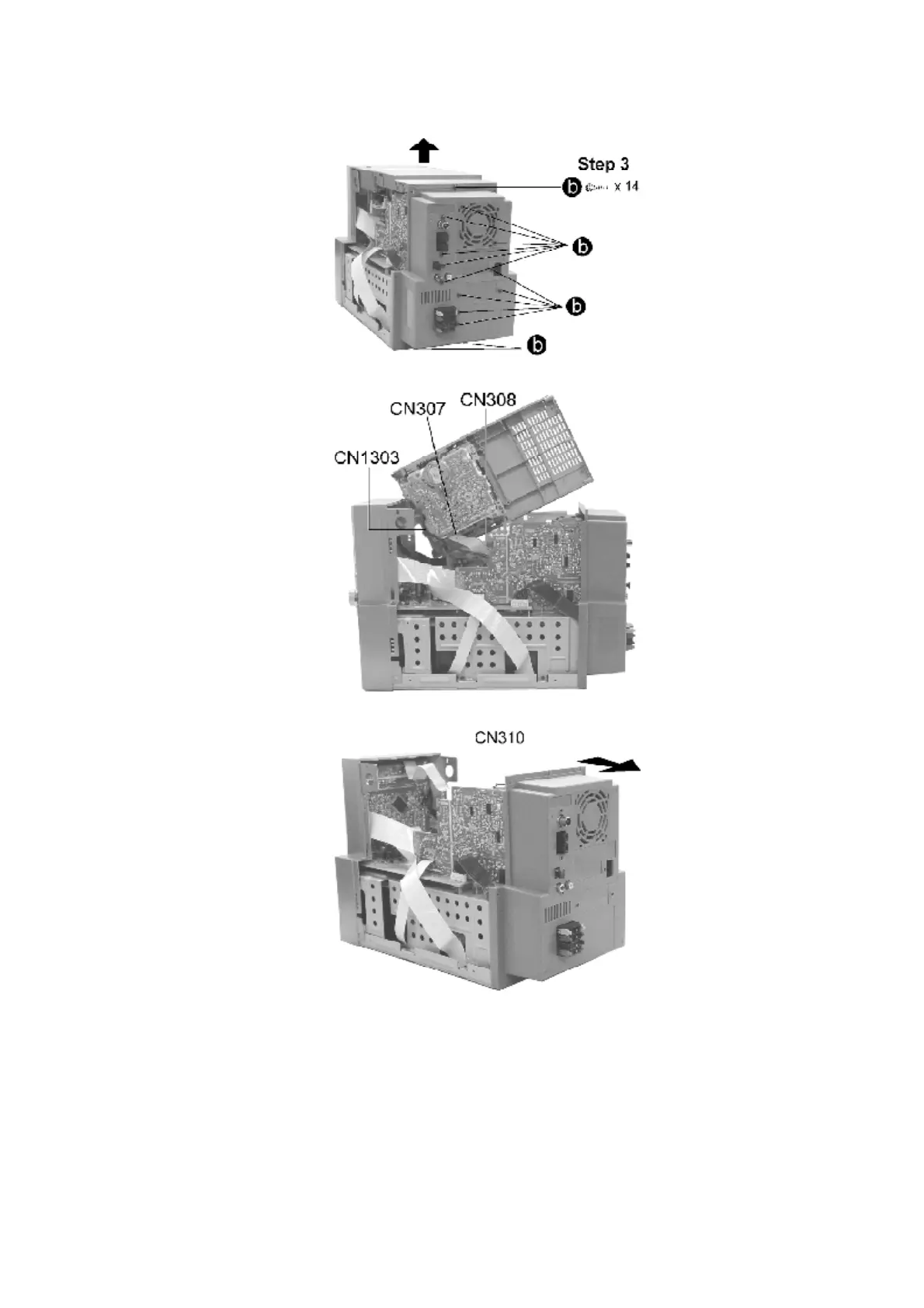 Step 4 Release the connectors CN307, CN308 and CN1303. Remove the cassette lid.