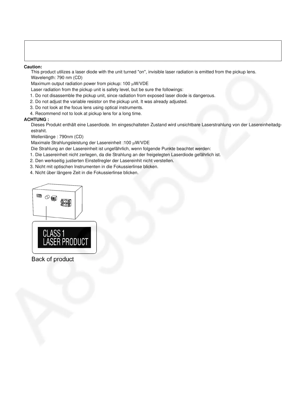 Laser radiation from the pickup unit is safety level, but be sure the followings:
