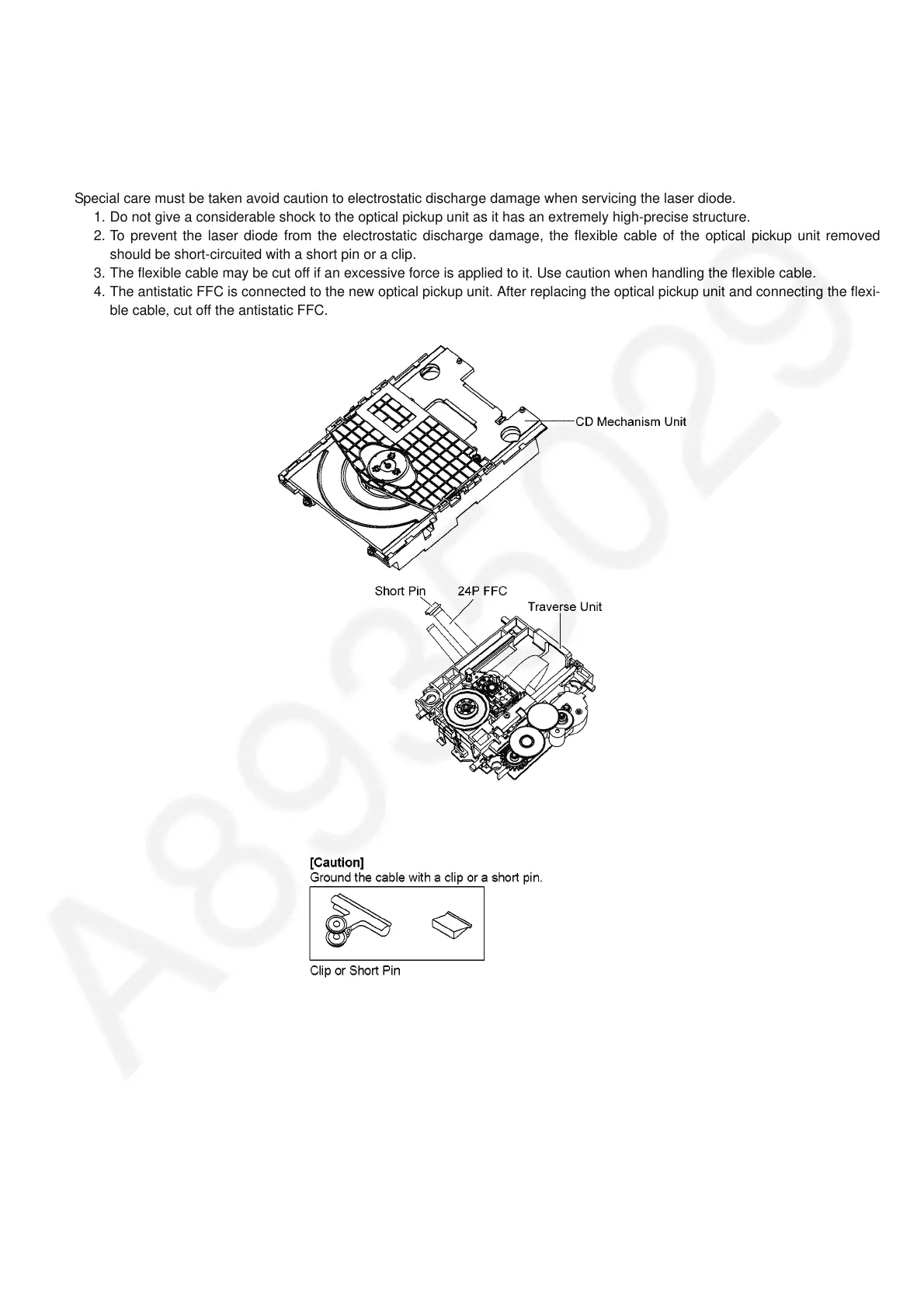 The laser diode in the optical pickup unit may break down due to static electricity of clothes or human body. Special care must be