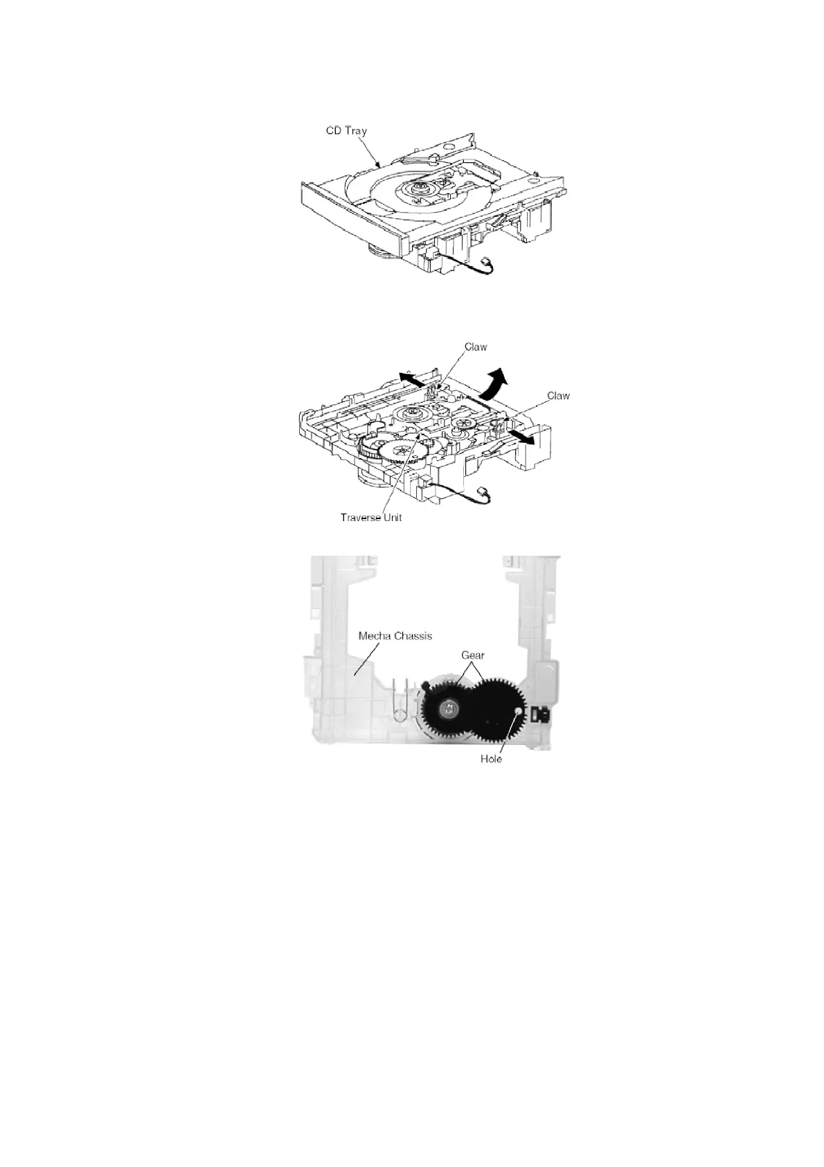 Step 1 Release the 2 claws and remove the CD Traverse Unit in the direction of the arrow.