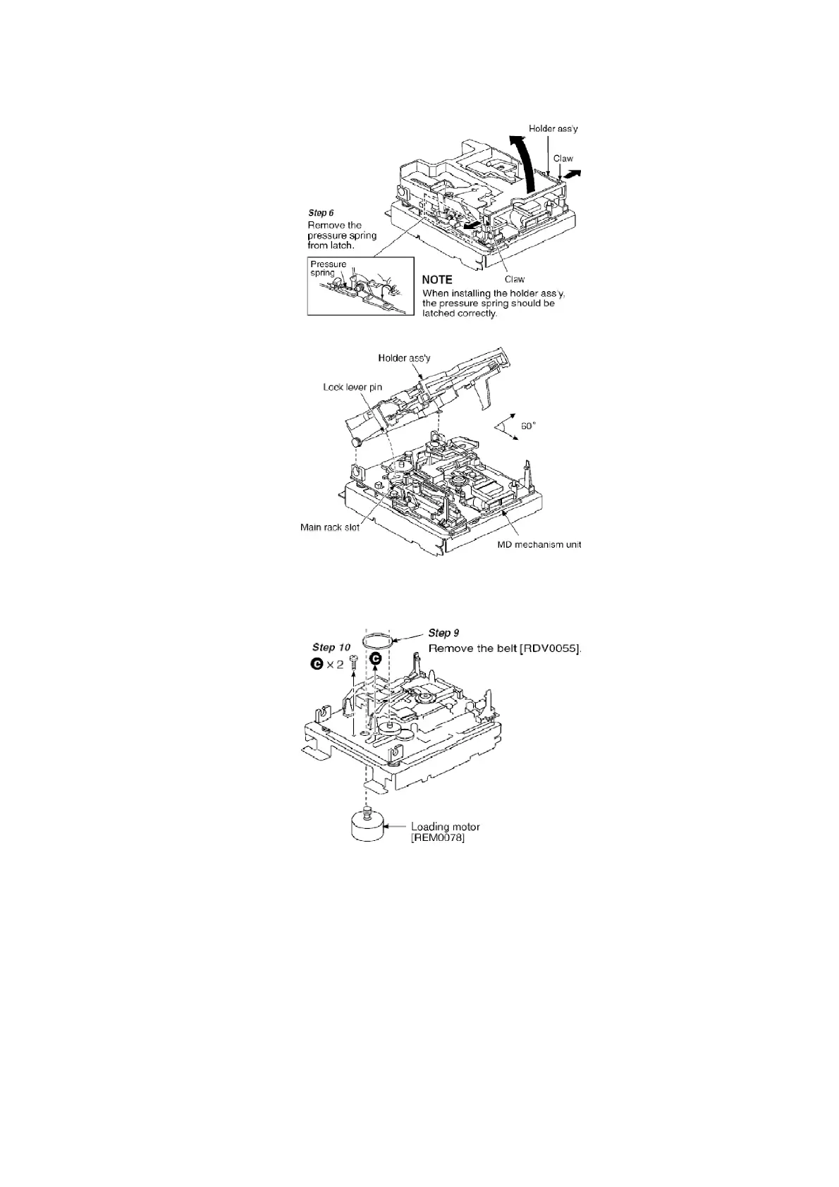 Step 8 Set the holder ass’y and MD mechanism unit at a 60 degree angle, and then pull out the
