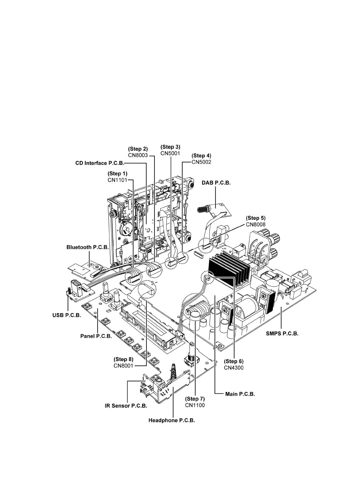Step 9 : Check Panel, Main, SMPS and CD Interface P.C.B. according to the diagram shown.