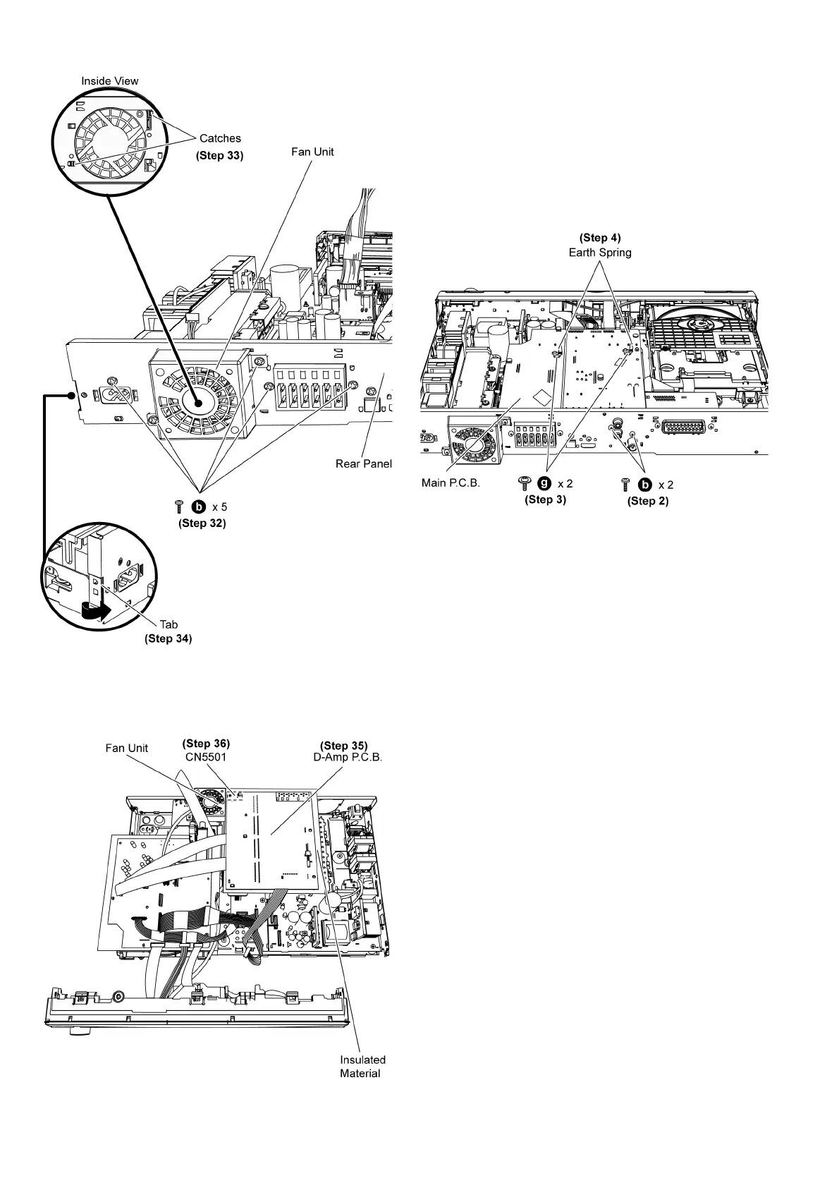 Step 35 Detach D-Amp P.C.B. from rear panel. Flip it according