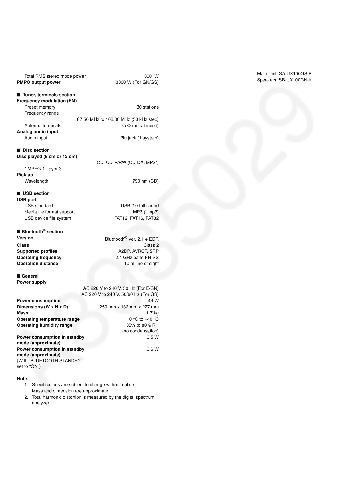 Main Unit: SA-UX100E-K