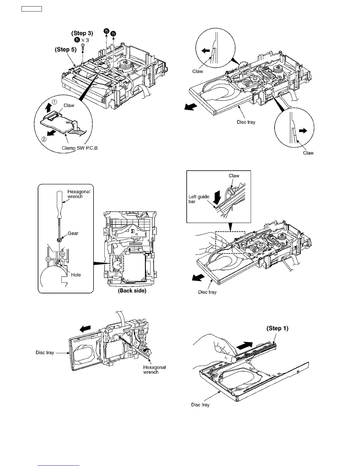 Step 8 Release the both claws, and then draw the disc tray.