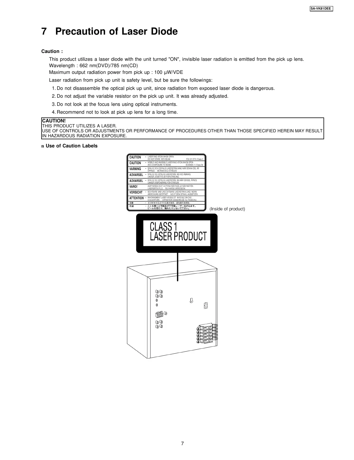 1. Do not disassemble the optical pick up unit, since radiation from exposed laser diode is dangerous.