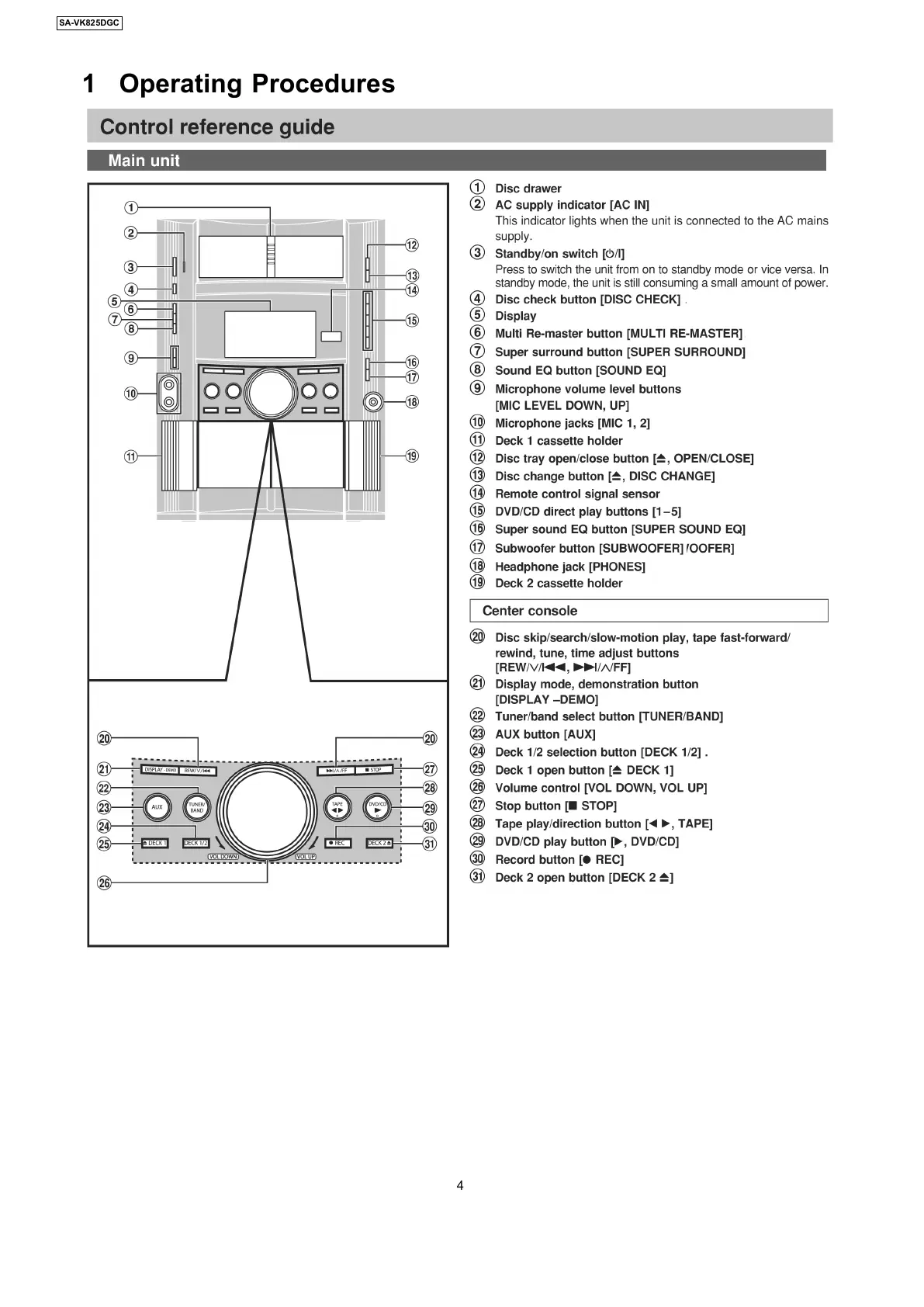 Panasonic SA-VK825D - Operating Procedures; Main Unit Controls; Center Console Controls